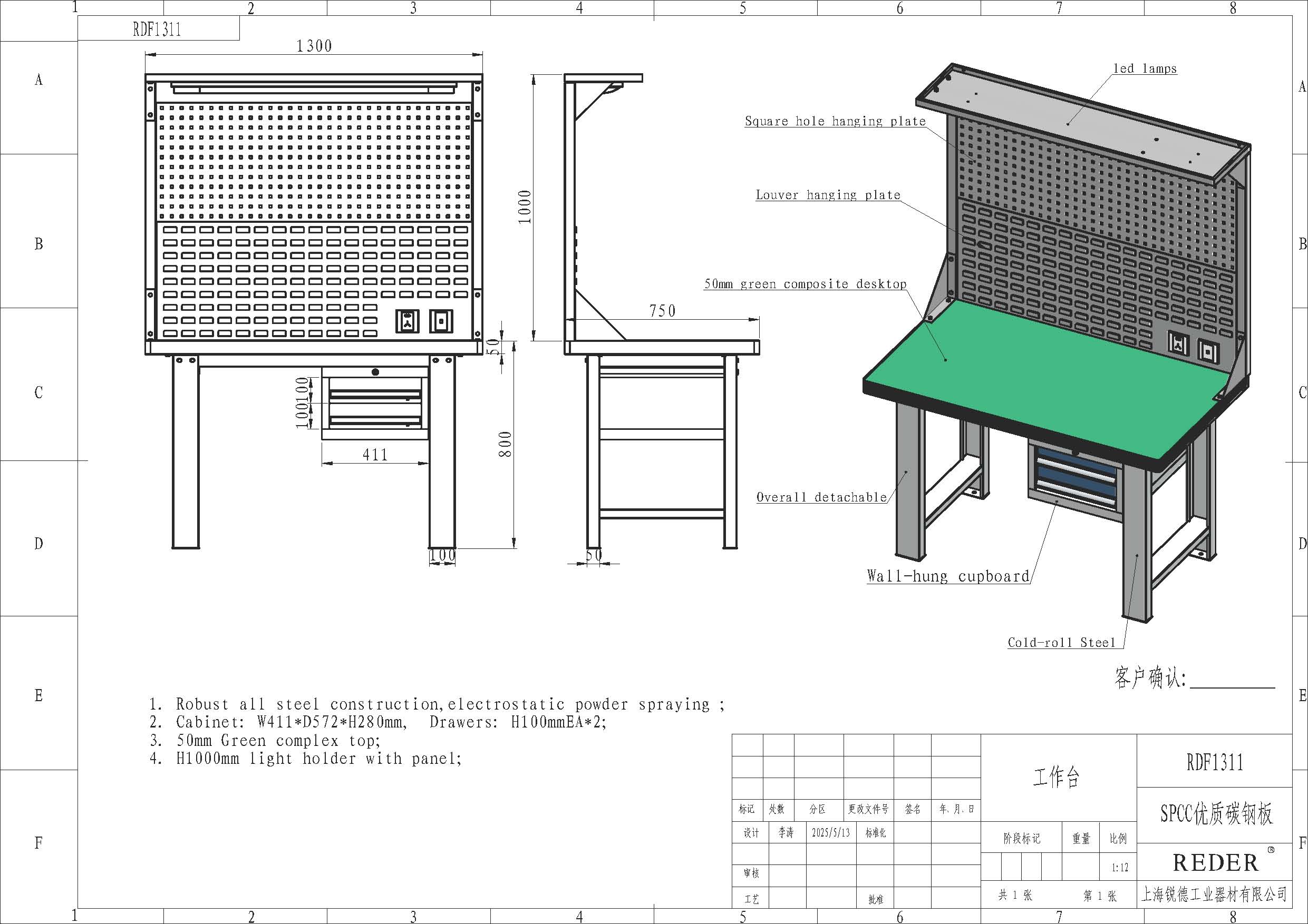1、标准桌面为50mm厚绿色复合台面(可直接安装台钳) 2、桌架采用2mm优质冷轧钢板4道折弯制作,桌腿规格100*50mm,整体载重1000kg
